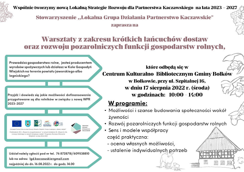 Do pracy nad strategia zapraszamy również rolników, producentów wyrobów spożywczych oraz przedstawicieli kół gospodyń wiejskich. Przygotowaliśmy dla Państwa Warsztaty z zakresu krótkich łańcuchów dostaw oraz rozwoju pozarolniczych funkcji gospodarstw rolnych. Państwa udział w szkoleniu i w ankiecie pomoże nam zaplanować działania w zakresach kierowanych dla rolników.