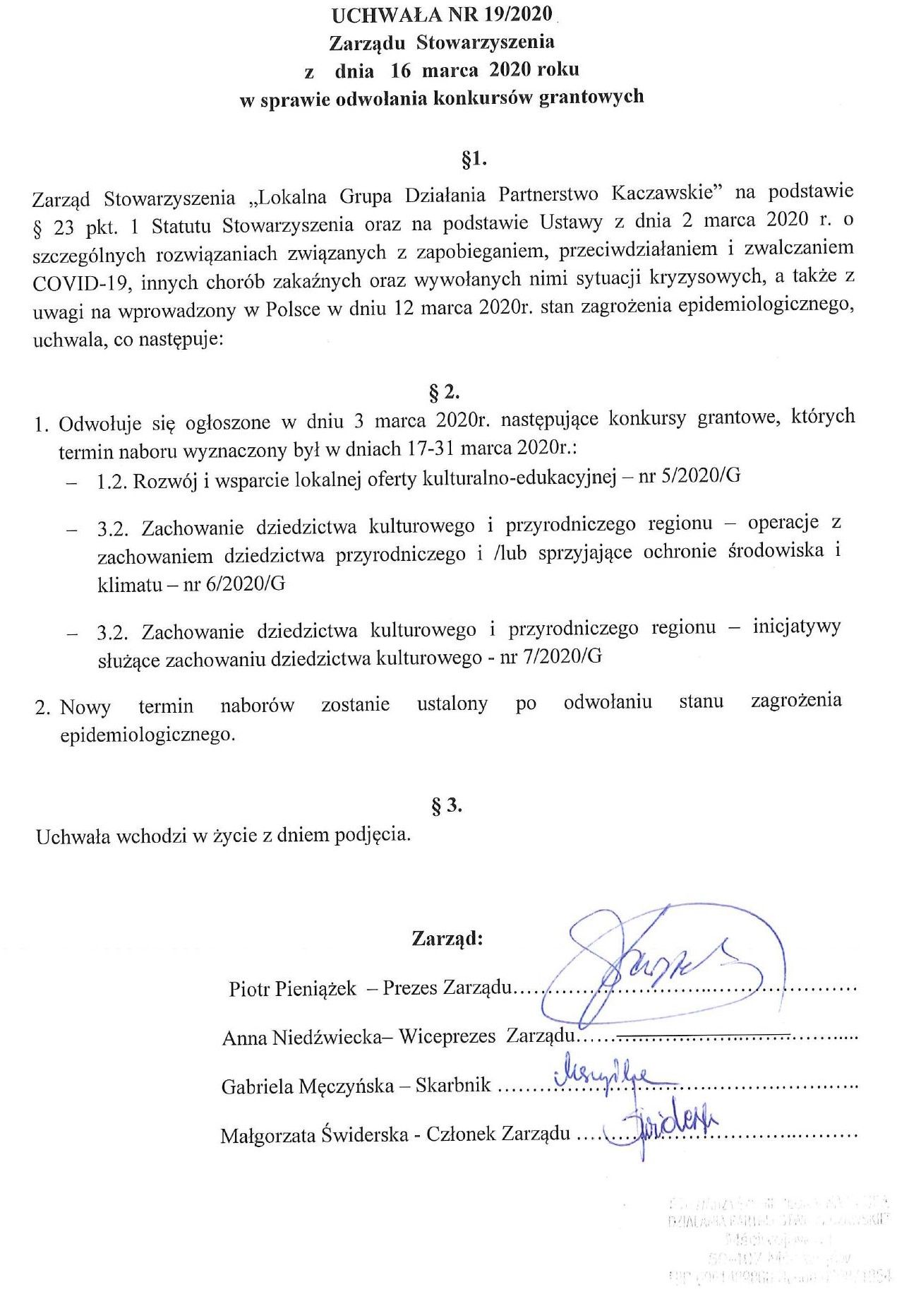 Informujemy, że Zarząd Stowarzyszenia „Lokalna Grupa Działania Partnerstwo Kaczawskie” podjął decyzję o odwołaniu konkursów na projekty grantowe, których termin rozpoczęcia miał nastąpić 17 marca 2020r.